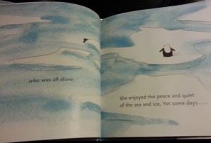 Then the text on the right side of the spread reads, “She enjoyed the peace and quiet of the sea and ice. Yet some days…”