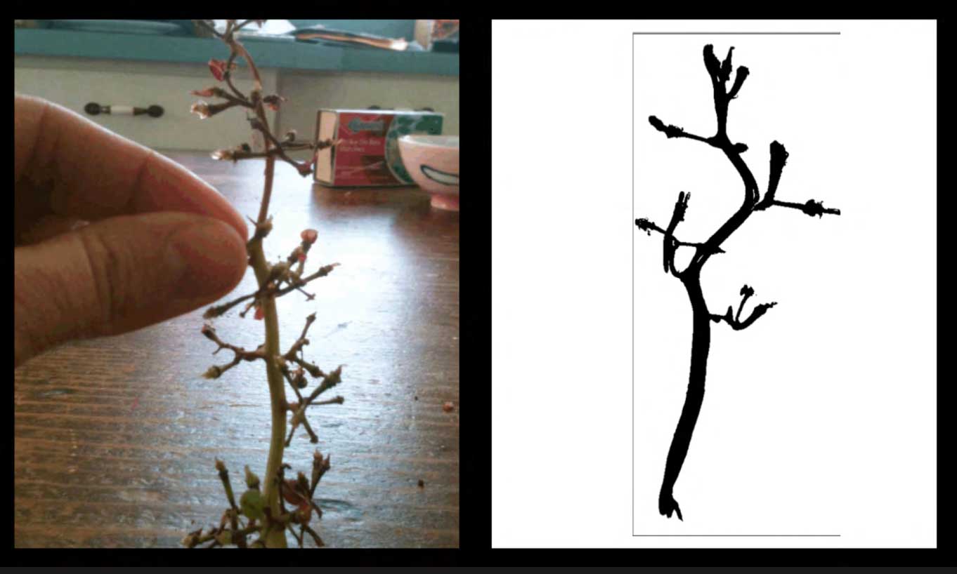 One day in 2010 my daughter Zoe was eating grapes. She came into my studio and held up the bare grape stem and said “Look Mom, a tree.” The grape stem did look like a tree, so Zoe and I scanned the grape stem into the computer and scanned some Japanese Maple leaves from the tree in our yard and began doing fun things in Photoshop. I then plopped a small pencil drawing of a little girl in with our tree creations and wrote “Maple loved her name.” This was another “growth ring” in Maple’s story.