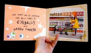 HM. Well, I think I went about it in a pretty ordered fashion. Even though I am a messy person in real life, when it comes to work I find I have to be very ordered and focused. Firstly I thought of the story. Then I thumbnailed the whole book, did a dummy book and then started making the final art! To make the final art I made miniature scenes- about dollhouse sort of size, out of paper and card and bits of fabric and then photographed them.