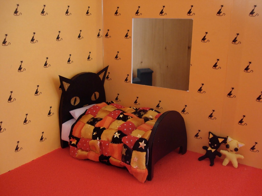 Oh my goodness, I love the tiny orange and yellow quilt on the bed, and the tiny food boxes, and the tiny plush kitties! Thanks for sharing, Harriet, and much success with all of your books!