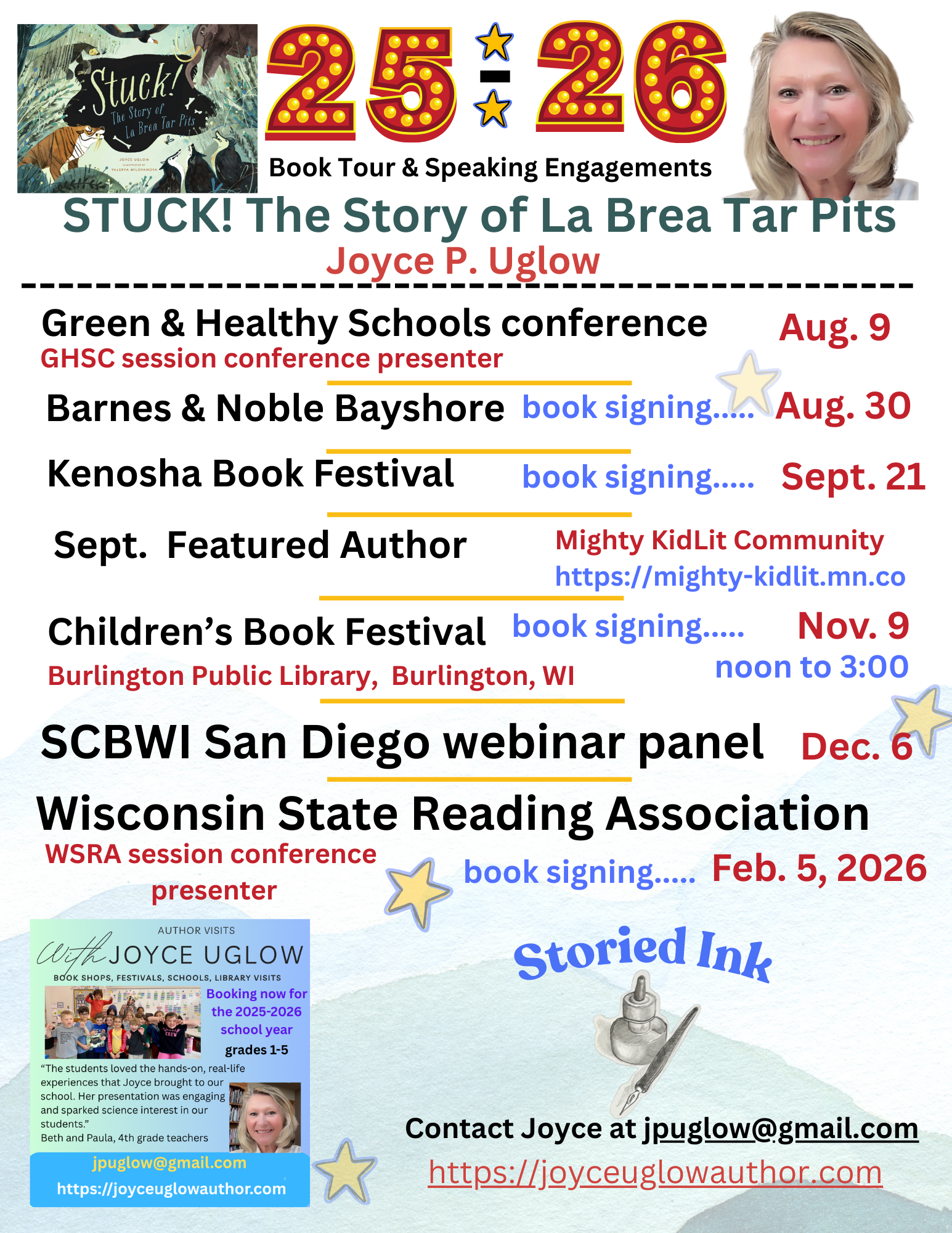 Folks, we have two fantastic giveaways today! Joyce is generously offering a signed copy of her fabulous book Stuck! The Story of La Brea Tar Pits to one lucky winner AND a picture book manuscript critique to another lucky winner. Just comment on this post by September 29th and mention if you’d like to be entered to win the book or the critique or either. I’ll choose two winners at random and connect them with Joyce. Good luck! (Book giveaway open to US residents only)