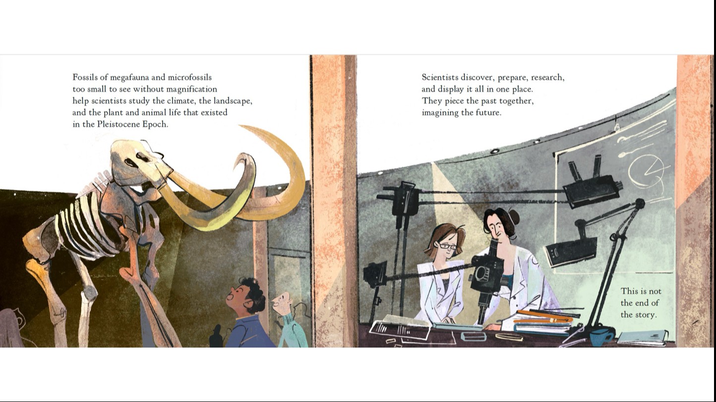 I was given the opportunity to take a look at Valerya’s art at an early stage and twice more before our book went on to its first printing. I could not stop smiling. We made a couple of changes in the art. The spread below shows the museum’s fossil lab. In early art, the two scientists were men. I asked for a change to depict Dr. Emily Lindsey and Dr. Regan Dunn. I love it!