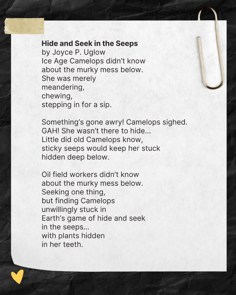 Hide and Seek in the Seeps uses a variation on the hide and seek poetry form. HERE is a link to my website where you can find all of the prompts and poetry form descriptions.