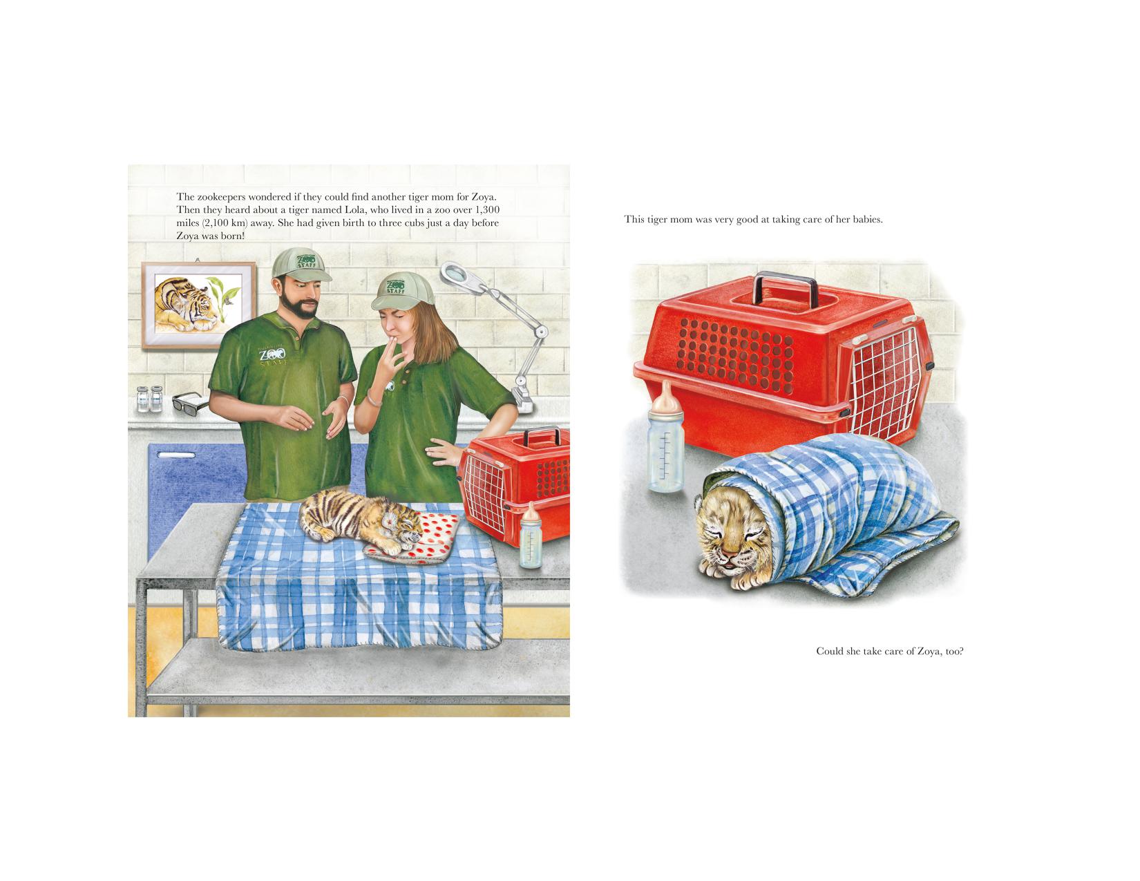 I was at the Philadelphia Zoo several years ago when I first learned about little Zoya, the only survivor from a litter of five critically endangered Amur tiger cubs. Zoya was rejected by her mother, which is apparently not uncommon for first-time tiger mothers. The zookeepers knew it would be much better for Zoya to be raised by a tiger rather than by humans. So they transported her to the Oklahoma City Zoo, hoping that a Sumatran tiger who recently had her own litter there would foster her. And, in fact, Zoya became the first cub ever to be “adopted” by another tiger subspecies! That heartwarming true story—and the cute photos of Zoya and her new tiger family—made me think it would be an inspiring book for children.