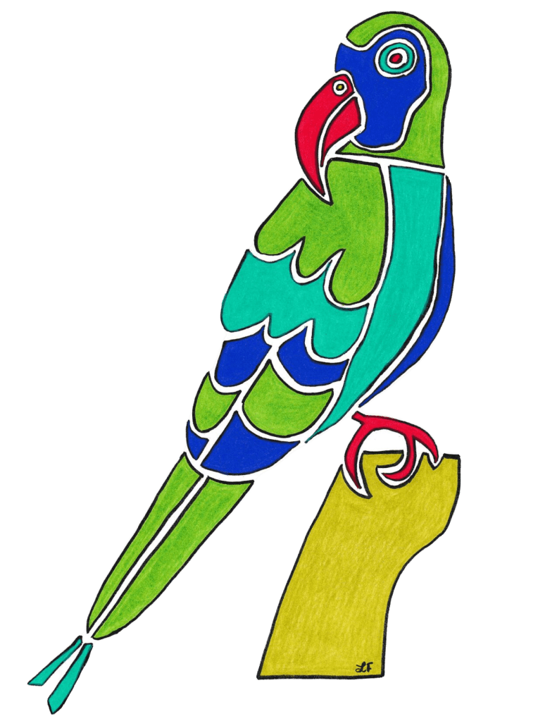 To purchase products featuring my original stylized parrot designs in seven different colors, please click HERE.