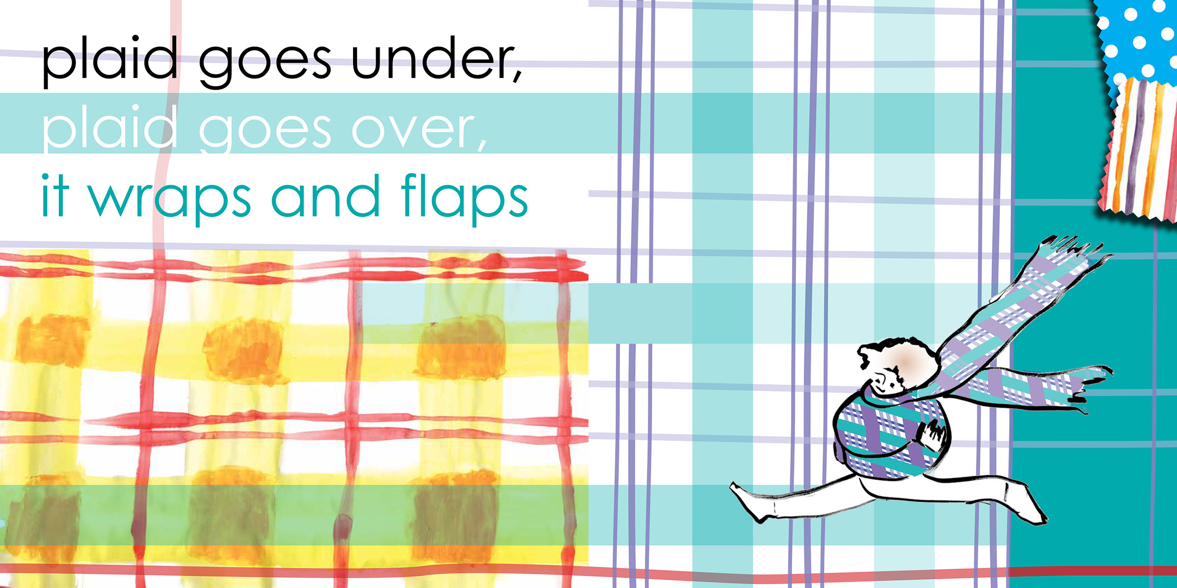 The short phrase-like description of the first couple of patterns became the structure for the words throughout the book. The idea that these different patterns could come together to form a quilt only came after I had spent time making and looking at the different patterns. Once I had the quilt idea, I realized that as each pattern was introduced, it’s swatch could be displayed on the next spread, alongside the previously introduced pattern swatches. The repeated swatches helped connect the separate patterns and serve as an inventory of all of the patterns introduced. They help to introduce the moment when the swatches come together to make a quilt. I used a mix of gauche paint and digital tools to create the patterns, assemble pieces, and layer and mix the images.